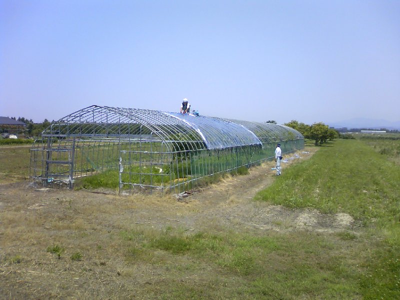 写真はぶどうの木のビニールハウスのビニール張りの様子。